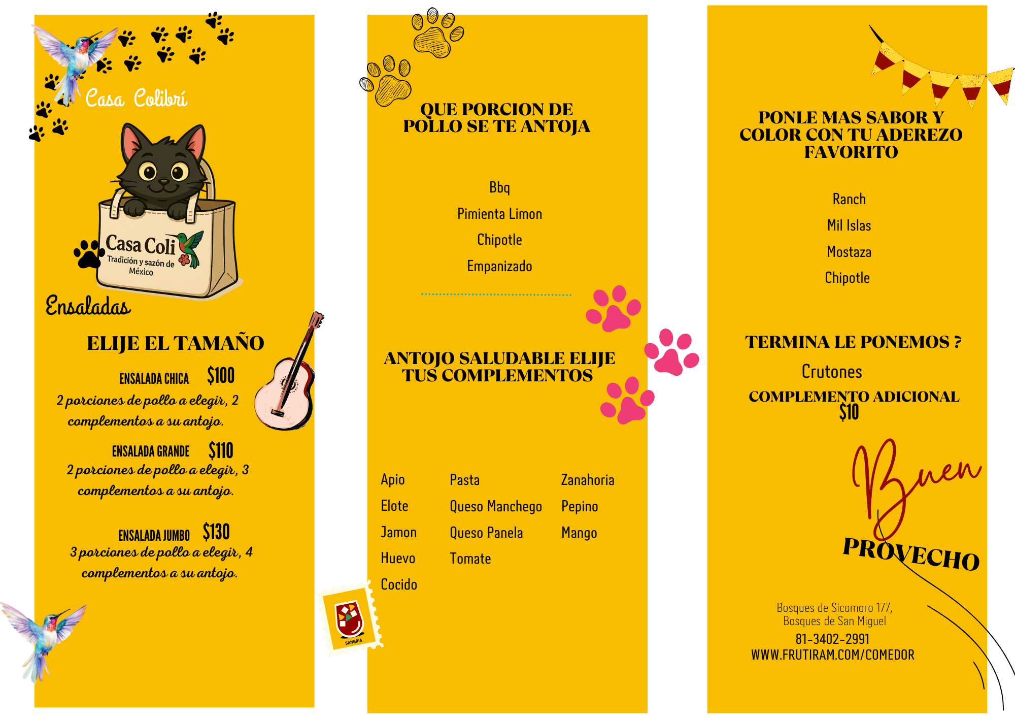 3 porciones de pollo a elegir, 4 complementos a su antojo.